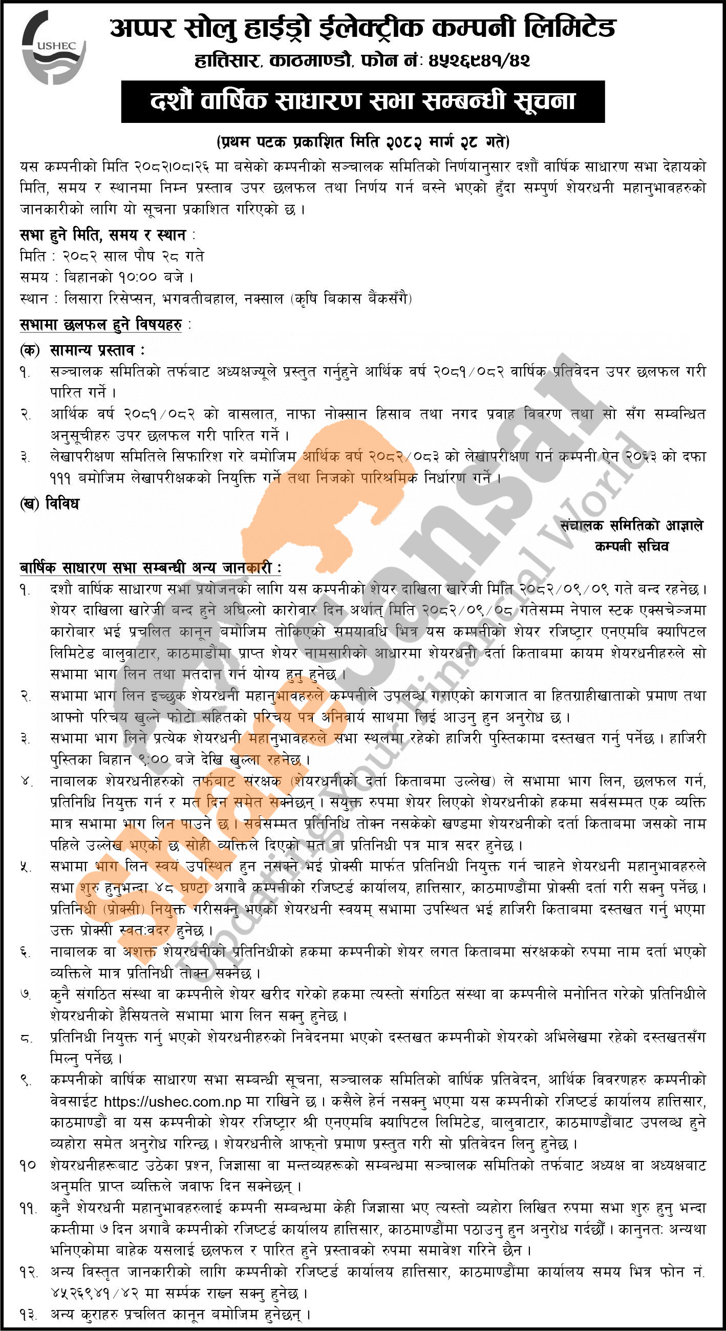 Upper Solu Hydro Electric Company Limited has announced its 10th AGM going to be held on 28th Poush, 2082.